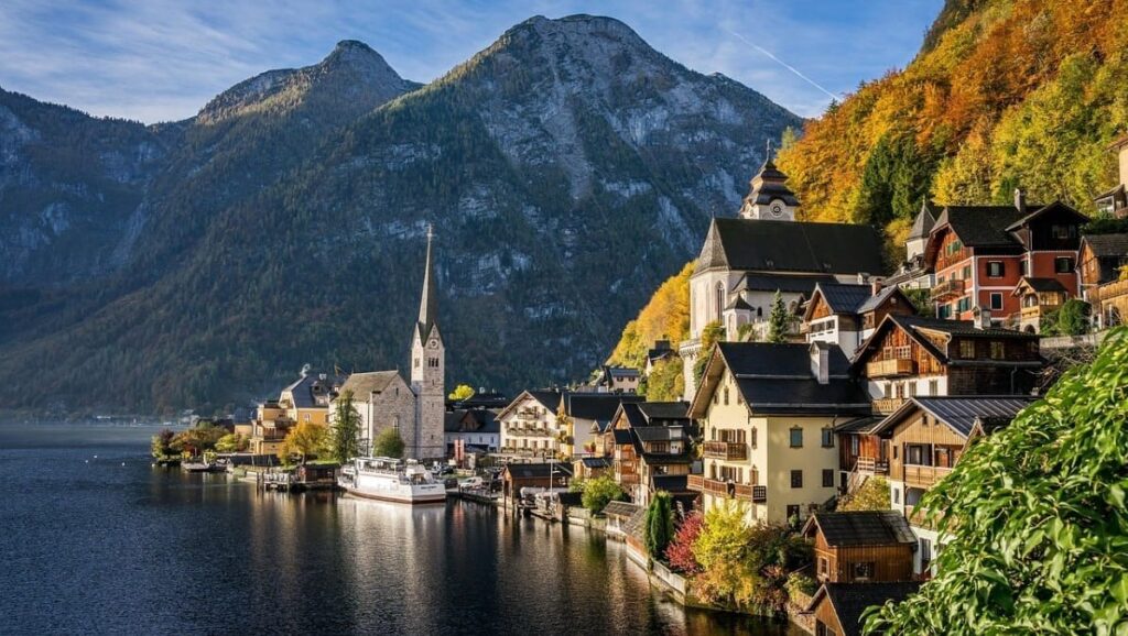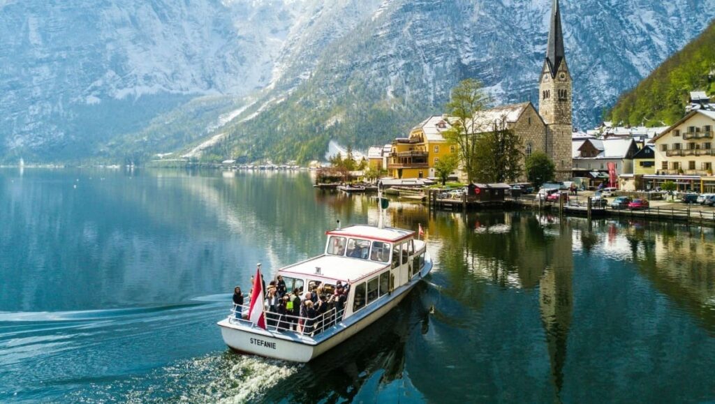 湖の上から見る村全体と、湖面に映る逆さハルシュタットの美しさは、地上からでは味わえない感動があります