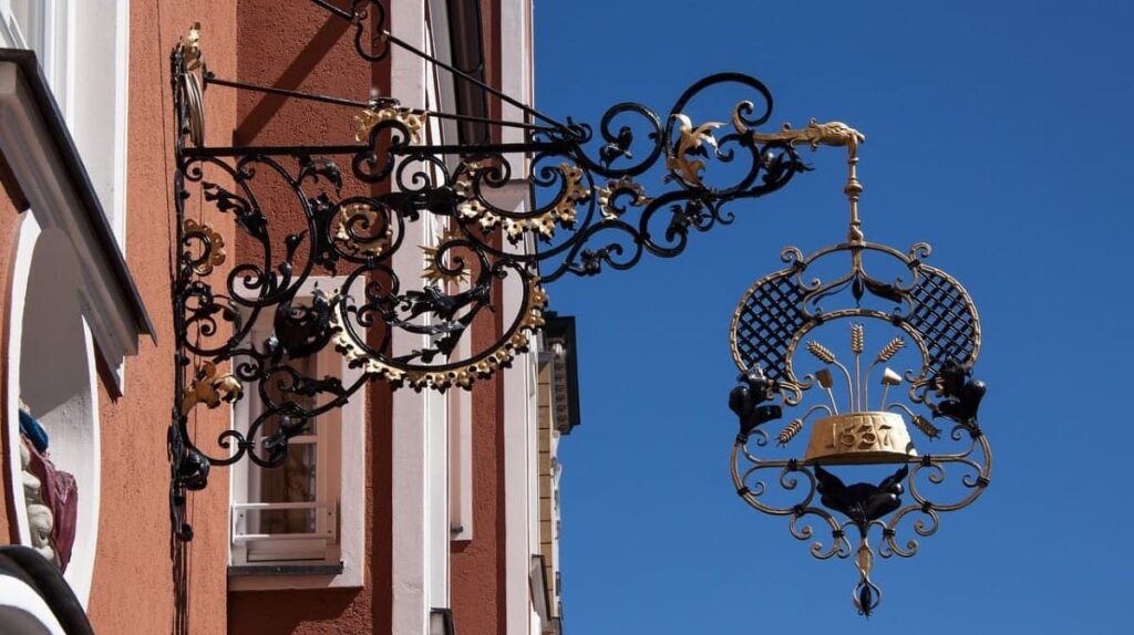 旧市街には、昔ながらの看板(ギルドサイン)を掲げる店が多く、チェーン店であってもユニークな鉄細工の看板を出しています