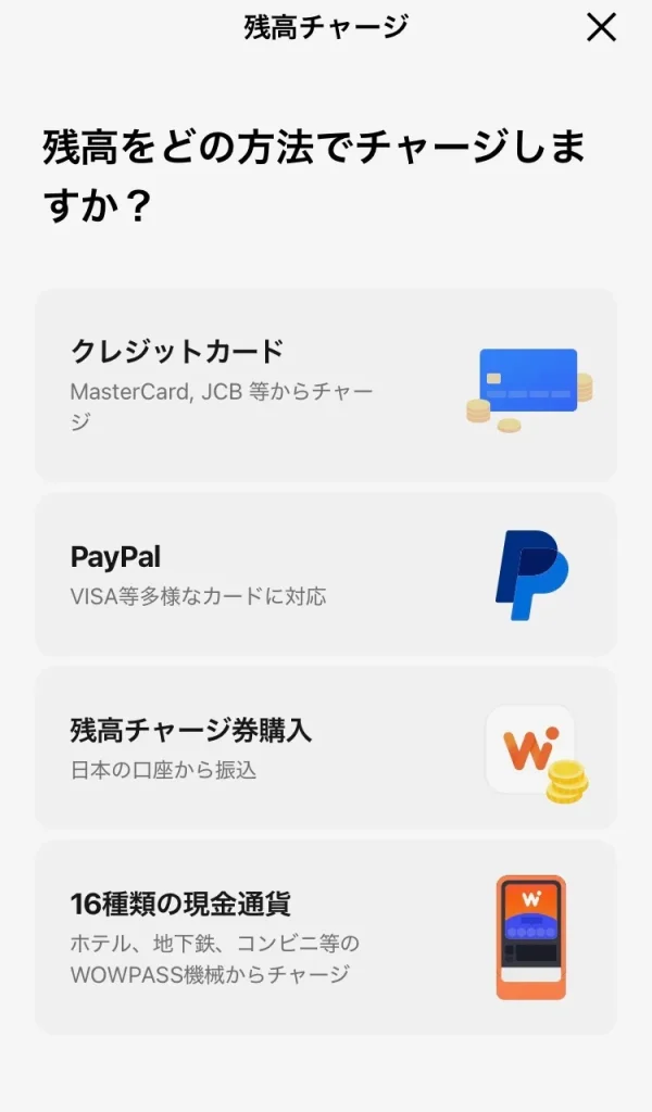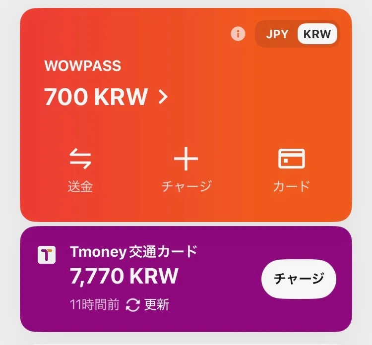 WOWPASSにクレカなどでチャージ→アプリ上でWOWPASSからT-moneyにお金を移動